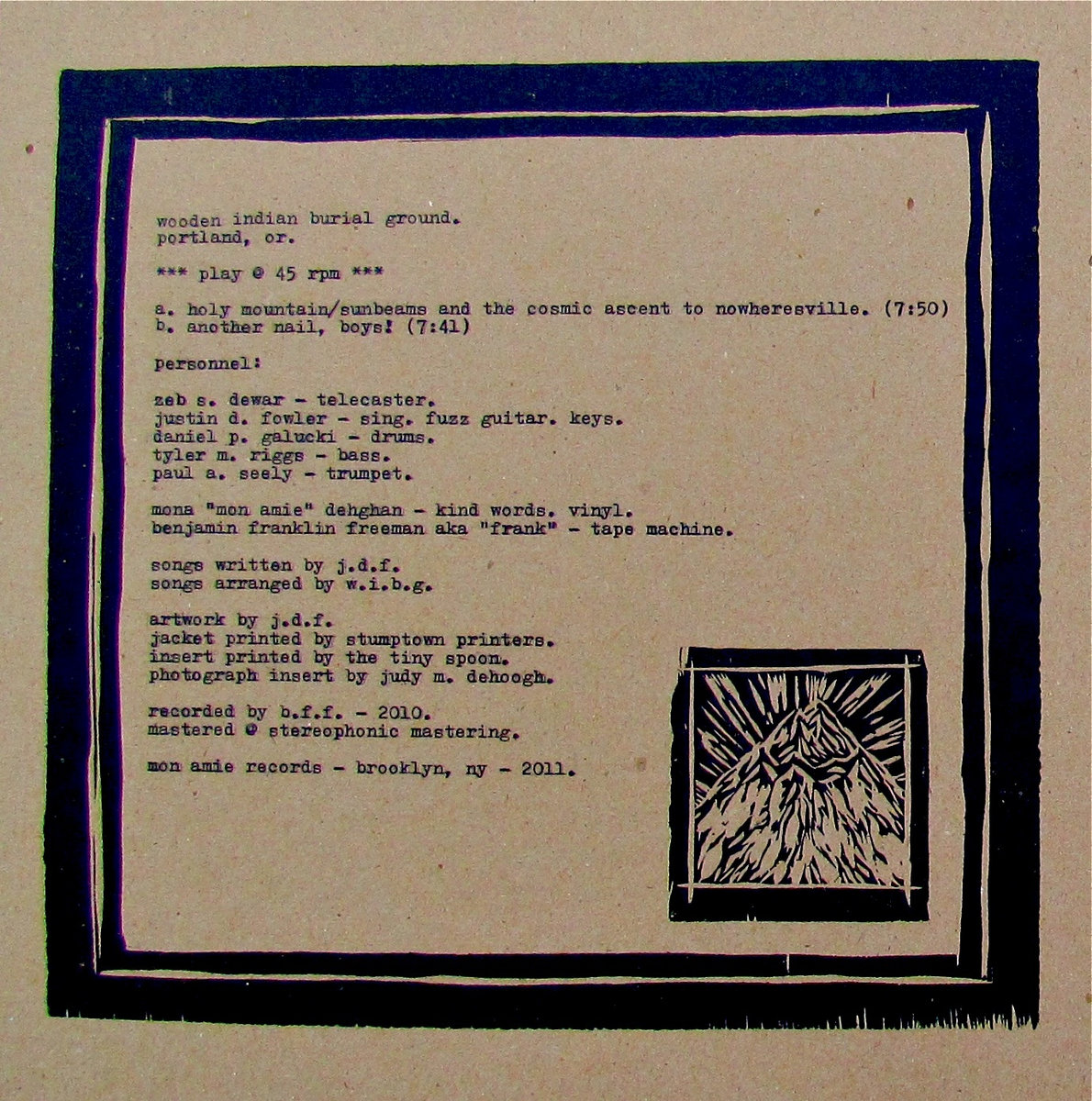 All artwork done by hand (by me) by way of woodcuts and typewriter, then delightfully printed with 100 year old technology by the fabulous Stumptown Printers. Includes a screen-printed woodcut/download card and a photographic insert.